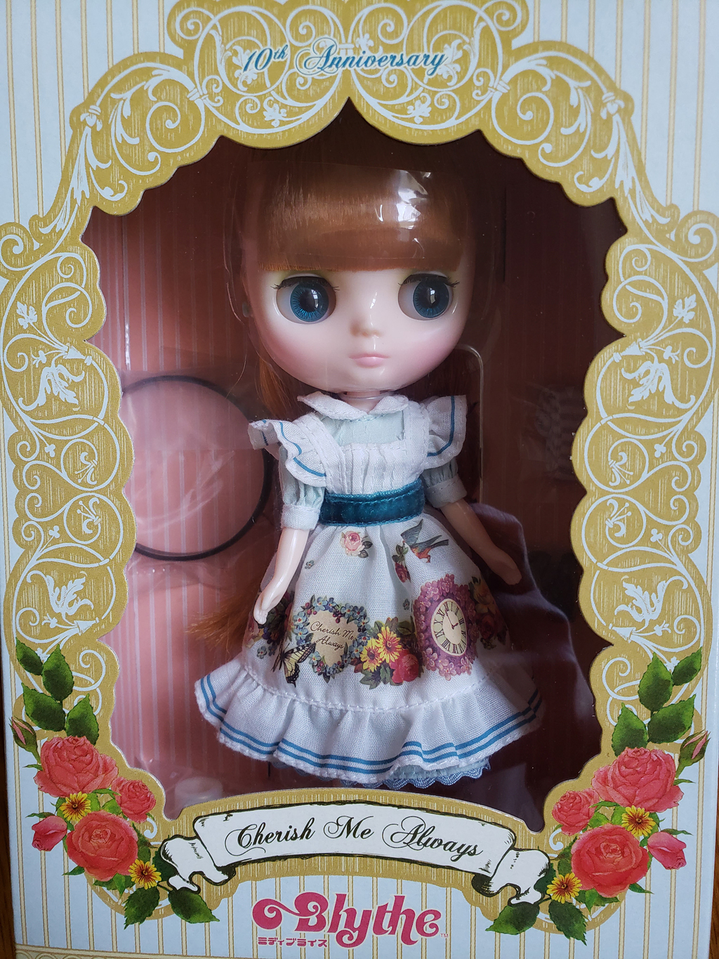 CWC Limited Edition 10th Anniversary Middie Blythe "Cherish Me Always" *FREE SHIPPING FEE* *Shipping address are subject to the address of your PayPal transaction. The lovely "Cherish Me Always" Middle Blythe is dressed in her best party fashion! Her apron style dress is baby blue and is adorned with sweet flower, butterfly and bird prints, similar to "10 Happy Memories". The detailing of the pin tucked bodice and light blue line printed along the hem of her dress. She also has the signature bow motif included in all of the anniversary doll designs. Under the top skirt of the apron dress, "Cherish Me Always" wears a baby blue dress with white rounded collar dress with balloon sleeves. Her outfit is complete with white and gray striped kneed socks, blue mary jane shoes with cute ribbon prints on the toes. Cherish has long, straight strawberry brown hair with bangs and she wears a black headband. She has sweet heart shaped earrings. She wears light-green eye shadow and her blush and lips are salmon pink. We picked blue eye chips from our new special eye color palette! Her skin tone is natural skin. [Skin Type] Natural [Make Up] Eye Shadow: Light Green, Lips and Blushes: Salmon Pink [Eye Color] Blue (Special Color) [Eye Lashes] Black (Special) [Hair Color] Strawberry Brown [Earrings] Heart Shaped Earrings Set Include: Doll, dress, apron, headband, earrings, socks, shoes, shirts, and doll stand. Limited edition of 3000 dolls We accept payment by PAYPAL, VISA and WESTERN UNION Thank you. Please don't hesitate to contact us at cctoyshop@yahoo.com.hk if you have any question about this product.