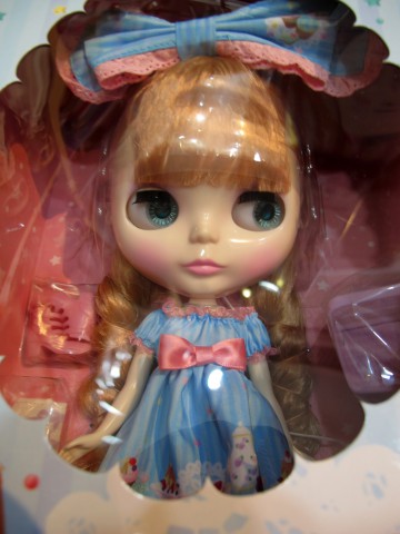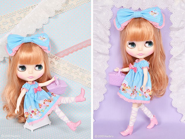 Neo Blythe Sadie Sprinkle is the Happy & Sweet Blythe! *FREE SHIPPING FEE* *Shipping address are subject to the address of your PayPal transaction. Sadie Sprinkles loves to bake sweets and loves to decorate with cute cupcakes and notions. Her adorable fashion is of course coordinated with her sweets theme! Her cute one piece dress has blue and light blue stripes and a cute trim of printed sweets around the hem! The hem is decorated with delicate pink lace and a cute satin ribbon on the chest. Her special hair band is a big bow with pretty pink lace trim. The ribbon can be removed from the white headband to make a more simple coordination. She wears high socks with ribbon lacing print and cute pink shoes. She comes with a purple basket to carry her sweet treats to her friends. She has long hair with a light wave perm and simple bangs. Her hair is a cute ash pink color. She has a special light green/blue eye color set to the right, with special light blue pupils. She has a special selection of pastel makeup to fit her pastel palette. She comes with a blue stand. Face Type: Radience Skin Type: Snow Make Up: Light purple eyeshadow, pink lips, light pink blush Eye Colors: Stock blue (front), Special Light Bluish Green with blue pupils to the Right, Stock Pink (front), Stock Green (left) Hair Color: Ash Pink Set Includes: Dress, Headband with detachable ribbon, knee-high socks, shoes, basket, underpants, and stand. Release Date: May 24, 2013 We accept payment by PAYPAL, VISA and WESTERN UNION Thank you. Please don't hesitate to contact us at cctoyshop@yahoo.com.hk if you have any question about this product.