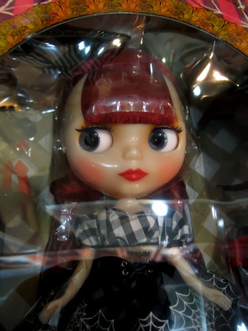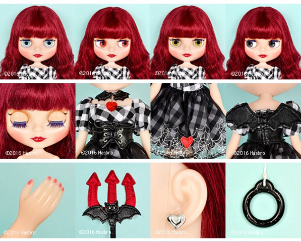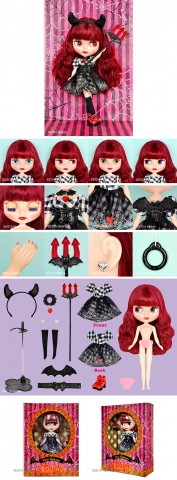 Infernally Dressed but Heavenly Hearted, CWC Exclusive Devi Delacour is here! *FREE SHIPPING FEE* *Shipping address are subject to the address of your PayPal transaction. It's hard to take your eyes off of cute and devilish Devi Delacour. Don't let her looks fool you! She may be a demon but she has a good heart. Devi Delacour has all the makings of a classic devil, from the horns on her head to the bat wings and tail, even the trident fork is part of her look. Her checkered dress and organdy back skirt with the spider web detail is her trade mark. A lot of detail is attached to her back, from the red heart shaped tail, and removable bat wings. Her belt is made to look like a corset, and her collar is modeled after bat wings. Her accessories are a horned hair dress and a pair of silver heart ear rings, along with her fork. She also wears black knee high socks and red strap shoes. Her hair is a distinct dark red, permed and long. Her face type is Radiance+, and her face color is a translucent cream. Her make up is done to give her a moody look. The dark brown eye liner and dark blue eye lashes are special, giving more oomph to her eyes. Her eyeshadow is dark brown, cheeks are salmon pink, and lips a darker rose pink. Her eyes are light blue, pink, yellow, and gray, all special colors! Her pull ring and stand (which is 17.5cm tall) are black with silver details. Facetype: Radiance+ Skin type: Translucent Cream Make up: Eyeshadow: Dark brown, Lips: Salmon pink, Cheeks: Rose pink, Eyeliner: Darkbrown Eye colors: light blue (front), pink (right), yellow (front), gray (left) *All special colors Hair color: Dark red *New color Ear rings: Silver hearts Manicure: n/a Eye lids: light brown Eye lashes: dark blue *New color Set includes: Doll, dress, lace-up belt, attachable collar, wings, knee high socks, head dress, Ear rings, boots, trident fork, shorts, stand Available: Oct. 22nd (Sat) We accept payment by PAYPAL, VISA and WESTERN UNION Thank you. Please don't hesitate to contact us at cctoyshop@yahoo.com.hk if you have any question about this product.