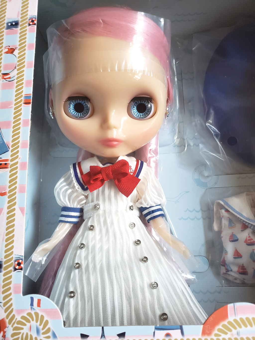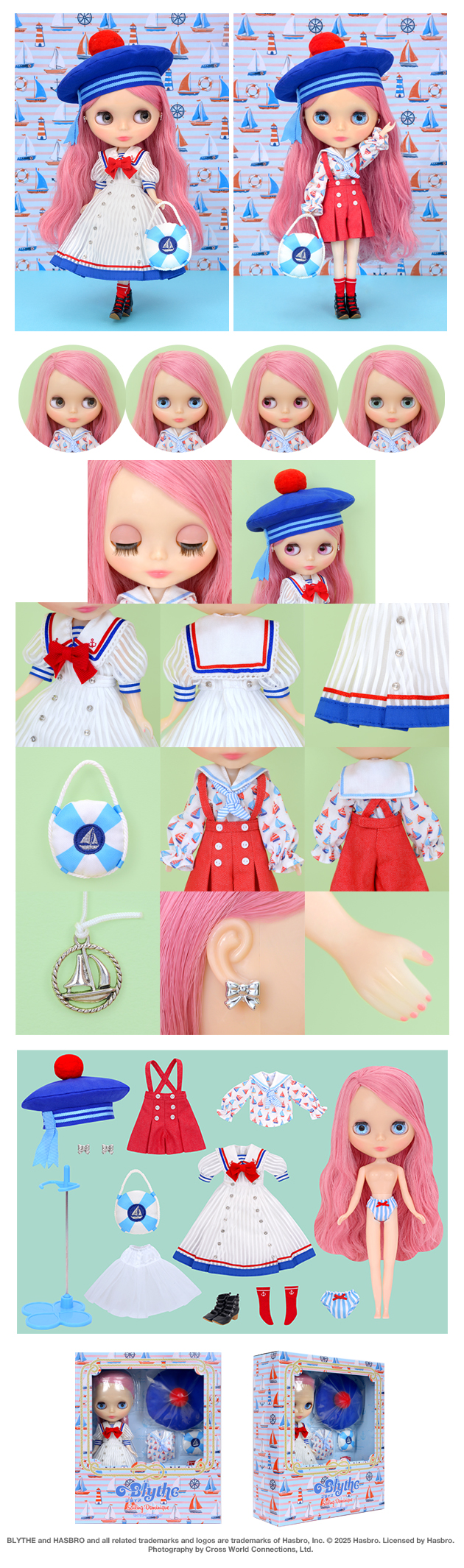 Announcement of the final specifications for the CWC Limited Edition Neo Blythe “Sailing Dominique”. *FREE SHIPPING FEE* *Shipping address are subject to the address of your PayPal transaction. On sunny weekends, I always head to the Grand Basin pond in the Luxembourg Gardens. I rented a little antique sailboat and let it drift across the water. When it nears the pond’s edge, I give it a gentle nudge with a long stick to send it back on course—it’s so much fun! Hi ho! All around me, children are just as excited, playing the same game! Dominique of the "Voiliers du Luxembourg" looks lovely in her fresh, breezy marine style. Dominique's white dress is perfect for a sunny, peaceful day. Made of a light, striped fabric, it has a sweet, subtle sheerness. The square sailor collar is accented with deep blue and red lines and a cute anchor motif, while a little red ribbon at the neckline adds a charming final touch. The skirt has pretty pleats that create a soft, flared silhouette, with matching lines at the hem to tie the whole look together. For a fun, new look, she can switch into a sweet blouse and culottes! The blouse has soft, voluminous sleeves with gathered cuffs, and the yacht-print fabric and striped tie give it a cheerful sailor-inspired feel. The culottes are so playful with their attached suspenders, making her look ready for a little adventure! Dominique's accessories are just as adorable. She wears a blue beret with a bright red pom-pom and carries a bag that looks like a life buoy. Her red socks have cute little anchor motifs, and her shoes are a stylish black with four straps. Even her eye-change charm has a tiny yacht on it! Her makeup is gentle and highlights her charming personality, and her hair is a beautiful new shade of mauve pink, giving her an elegant, Parisian-inspired flair. Face Type: Radiance Evolution Face Color: Translucent cream Makeup -Eyeshadow: Taupe Pink -Lips: Pink (with a plump shape) -Blush: Pink Eye Colors (All Special Colors) -Gray (right) -Light blue (front, with hologram) -Light magenta (left) -Aqua green (front) Eyelids: Taupe Pink (mold color) Eyelashes: Special type / Black Hair Color: Mauve Pink (new color) Earrings: Yes (Silver ribbon-shaped) Manicure: Yes (Pink beige) Set Includes: -Doll, dress, blouse, culottes, hat, petticoat, socks, bag, earrings, shorts, shoes, stand (waist support) Release date: Monday, September 29, 2025 We accept payment by PAYPAL, VISA and WESTERN UNION Thank you. Please don't hesitate to contact us at cctoyshop@yahoo.com.hk if you have any question about this product.