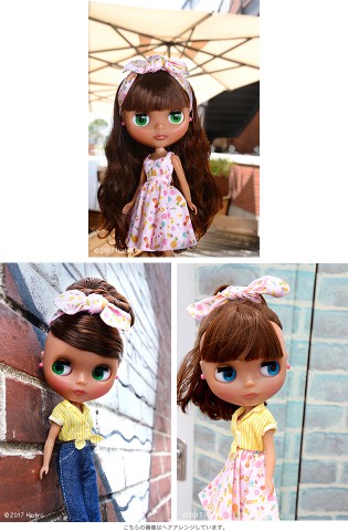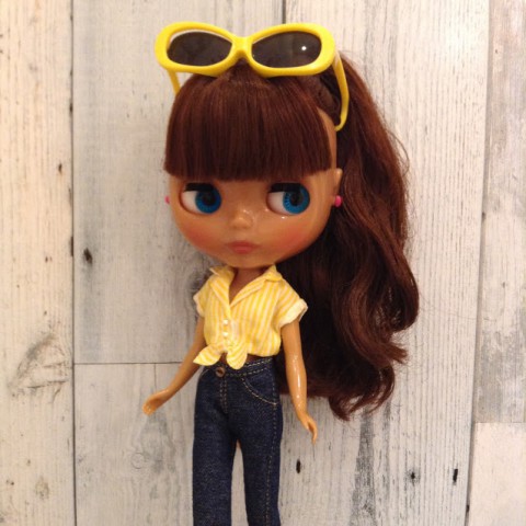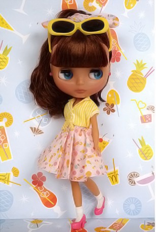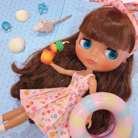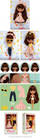 Doesn’t her tanned skin dazzle against the sun? Neo Blythe Pineapple Princess is coming soon! *FREE SHIPPING FEE* *Shipping address are subject to the address of your Paypal transaction. I love those sweet, juicy pineapples that have soaked up the summer sun! Nowadays I love to have it in cold ice tea. I love pineapples so much that my boy friend calls me "Pineapple Princess"! I love my boyfriend and my new nick name! American 50's fashion is Pineapple Princess' favorite look. She has an assortment of outfits, for the beach, out on the town, and even for sports! Change her clothes to match the occasion! Her tanned, translucent skin and her bright aura is exactly what you expect from the Pineapple Princess! The fabric of her dress is specially printed with an original pattern of pineapples and drinks. Along with the flowing skirt and the gather on the chest, the dress has tons of girlish charm. The capris she is wearing are made from denim. Her french sleeved shirt is perfect in any combination; over her dress, with the cherry pink heart ear rings and pumps, the vivid colors give her a sprightly and energetic ambiance. The hair band that comes with the dress is a great way to mix up her look too! Her face color is a newly made translucent Mocha color, which has a alluring subtlety to it. Her face type is Radiance Renew. Her hair color is brown, and her hair style is a slightly permed long with short bangs. Her eyeshadow is dark brown, and her cheeks and lips are almond pink. One of her front facing eyechips are light green. Face Type: Radiance Renew (Based on the Radiance mold) Face color: Translucent Mocha Make up: Eyeshadow - Dark brown, Cheeks and Lips - Almond Pink Eye color: Light green (front) *special color, Blue (right), Pink (front), green (left) Eyelashes: Black Hair color: Brown Ear rings: Cherry pink hearts Manicure: n/a Set includes: Doll, dress, shirt, pants, sunglasses, hair band, ear rings, socks, shoes, shorts, stand (17.5 cm tall) Available: July 14, 2017 We accept payment by PAYPAL, VISA and WESTERN UNION Thank you. Please don't hesitate to contact us at cctoyshop@yahoo.com.hk if you have any question about this product.