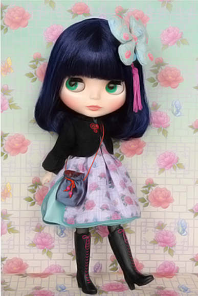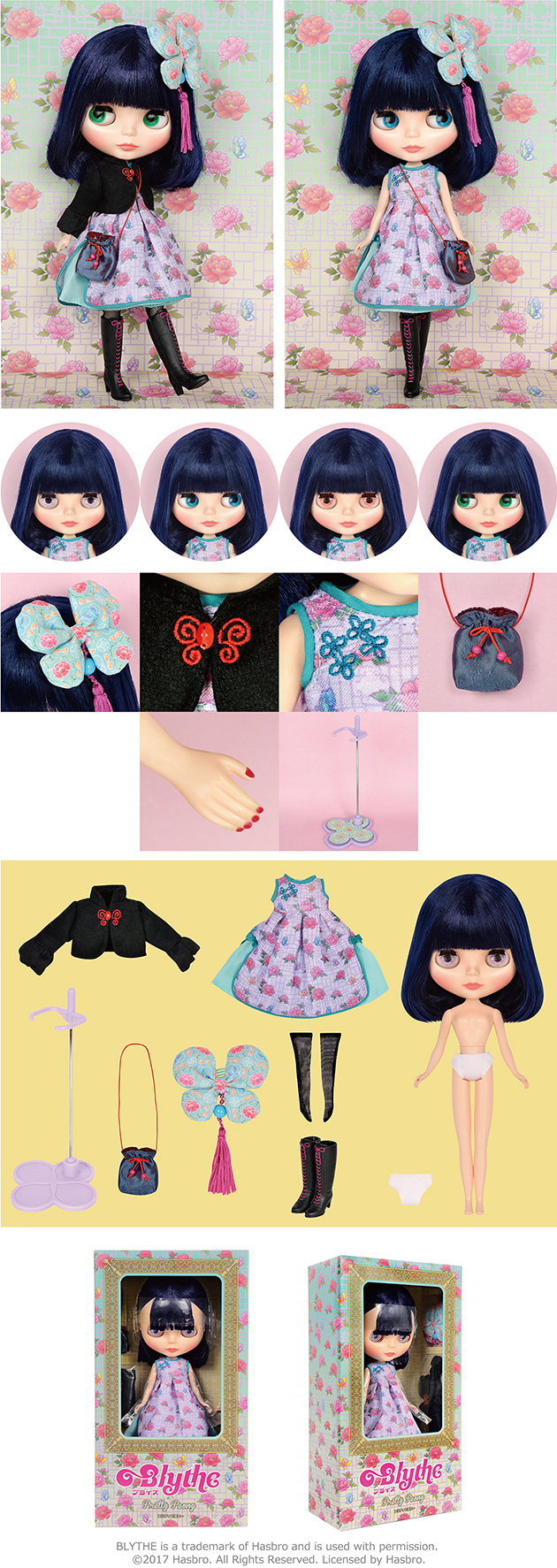 Go out into town with a Chinese flare! Neo Blythe Pretty Peony Final Specs! *FREE SHIPPING FEE* *Shipping address are subject to the address of your PayPal transaction. Peony is knowledgeable on a lot of different subjects, so when her friends ask her questions she's quick to answer! There's a lot of fans of hers that love her fashion too. She stays humble even when her friends praise her, and she becomes friends with everyone naturally too. Peony looks great in modern Chinese-style fashion. A lot of that essence is visible in the textiles and detail present in her clothes. Her flower patterned dress is decorated with Asian style knot embroidery and the side slit evoke a very elegant beauty. Her hair accessory is a beautiful butterfly! A round stopping bead and fringes give it a striking look. The lustrous black bolero she wears is also decorated with an embroidery of a red butterfly. Her pochette uses a drawstring mouth and red Asian chord for the strap. She wears kneehigh socks and black lace-up boots. Her face type is Radiance+, and her face color is fair. Her hair is bobbed, and her hair color is ink blue. Her eyeshadow is brown, and her cheeks and lips are salmon pink. One of her front facing eye chips is a special light purple color. Face Type: Radiance + Face Color: Fair Makeup: Brown eyeshadow, salmon pink lip, salmon pink cheek Eye Color: Light purple (front *special), blue (right), green (front), pink (left) Eyelid: Default Eyelash: Default Hair Color: Ink blue Earrings: N/A Manicure: N/A Set Includes: Doll, dress, bolero, hair accessory, pochette, high socks, boots, shorts, and stand (17.5 cm) Release date: February 16, 2018 We accept payment by PAYPAL, VISA and WESTERN UNION Thank you. Please don't hesitate to contact us at cctoyshop@yahoo.com.hk if you have any question about this product.