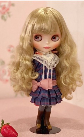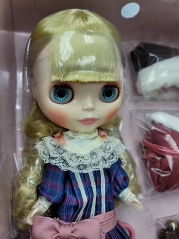 CWC Exclusive Neo Blythe “Song of London Mary” *FREE SHIPPING FEE* *Shipping address are subject to the address of your Paypal transaction. I live in the Victorian era London. I am very close to my family and all my sisters love fashion! It is fun to go out dressed up in finery like porcelain dolls. My dream is be to a novelist when I grow up, so I study hard. Let’s make a wish for my novel to be published some day! “Song of London Mary” loves the classic fashion of the Victorian era. She wears a dress that is dark blue, light blue and burgundy checkered fabric with coordinating off-white lace and smoky pink ribbons for a nuanced color scheme. The lacy false collar, low waist skit with two layers of box pleats, and large pink ribbon and more. The design is classic taste with refined style. The velvet coat, hat and muff can be worn when going out on the town. The coat is dark pink flared silhouette with an integrated cape and coat. It is trimmed with a braid and decorated with fur on the collar and cuffs. The hat is a matching design to the coat. It is a hood type with a short brim that softly wraps the face with fur and lace. The top is decorated with brown velvet ribbon and a wide dark pin satin ribbon is tied around the head. She has a corded muff, grey knee-high socks. mustard brown boots, and long bloomers. The face type is Radiance Evolution (New Mold based on Radiance Renewal) Face color is snow. Hair color is a popular blonde with bangs and a long perm. She wears Pink beige eyeshadow, pink lips, salmon pink cheeks, and has Pink beige molded plastic eyelids. She has special brown eyelashes. Her eye colors are: light blue front, blue right, brown right, and light pink left. Face Type: Radiance Evolution Face Color: Snow Makeup: Eye shadow: pink beige, lips: pink, blush: salmon pink. Eye Color: Light blue (front), blue (right), brown (right), light pink (left). *all special eye colors Eyelids: Pink beige (molded color) Eyelashes: Special brown eyelashes with jagged cut tips. Hair color: Blonde Set includes: doll, hat, coat, false collar, dress, muff, drawers, socks, shoes, stand (approx. 13cm high) * The target age group for this product is 15 years old. *Specifications may differ from final product. Release Date: February 25, 2022 We accept payment by PAYPAL, VISA and WESTERN UNION Thank you. Please don't hesitate to contact us at cctoyshop@yahoo.com.hk if you have any question about this product.